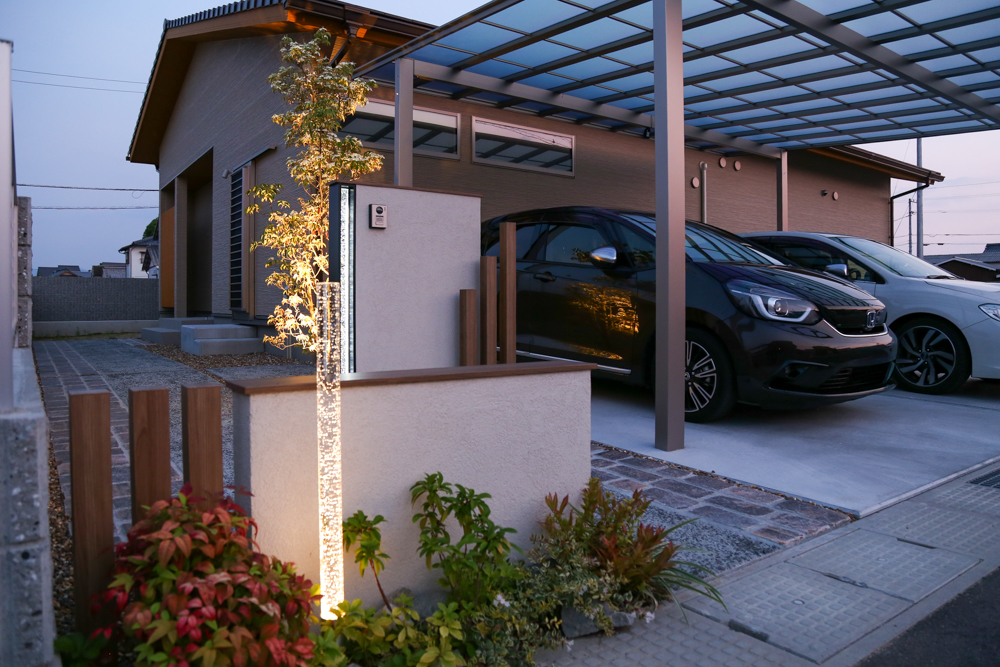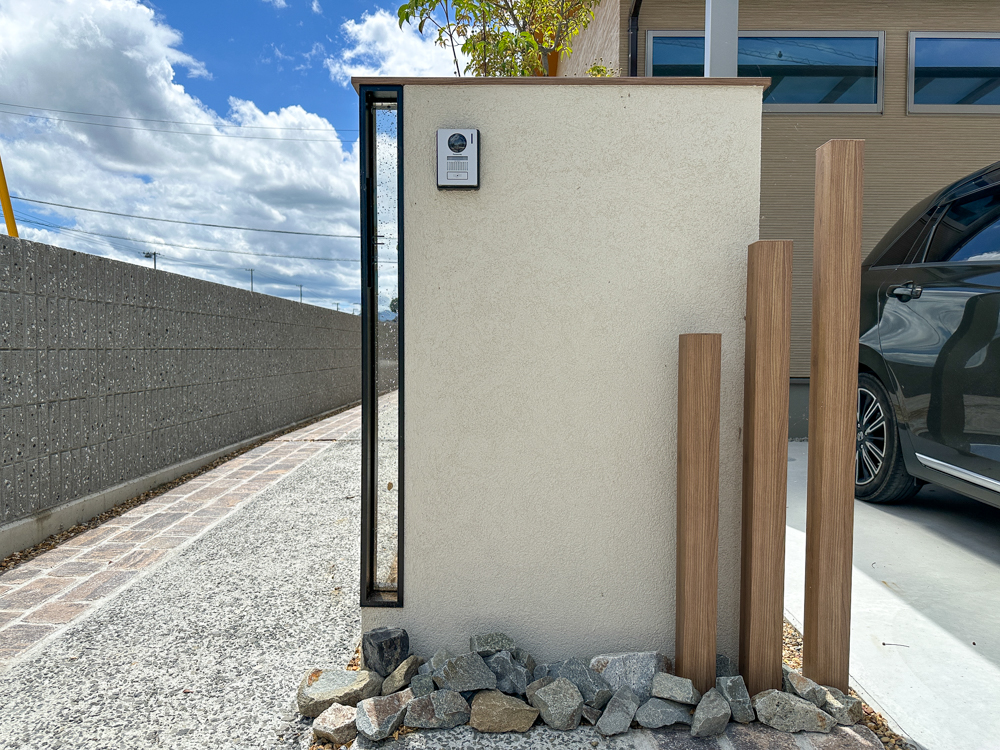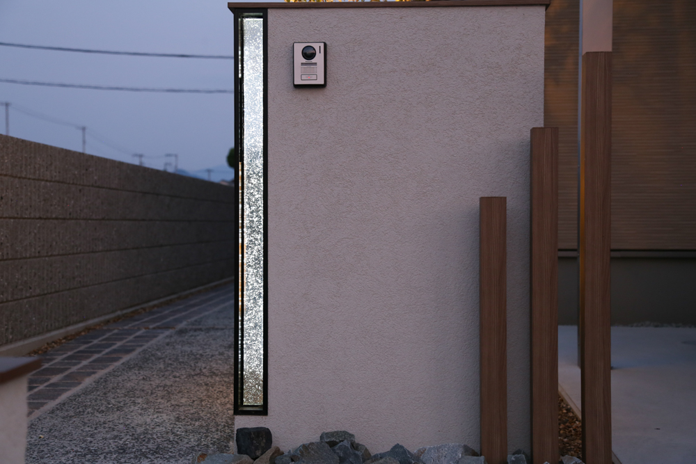 門柱は塗り壁と木調を使用し表札はエクアライブ商材「HEIZO」で夜はガラスを輝かせます。