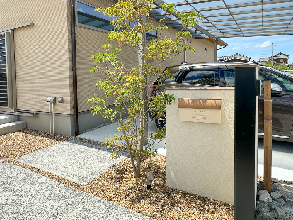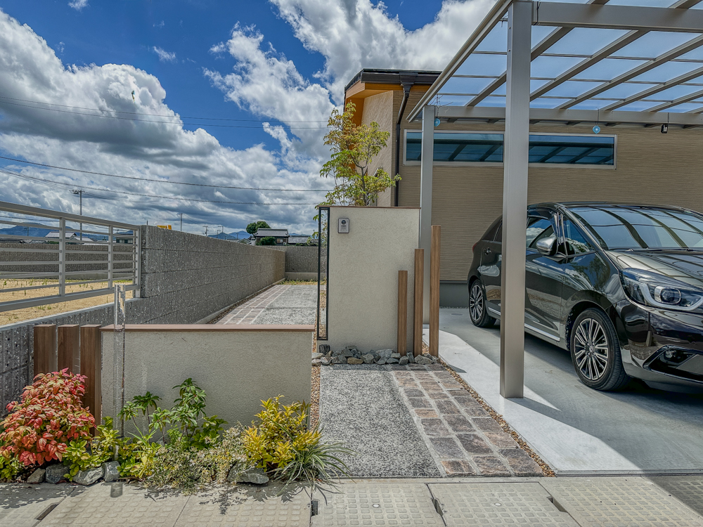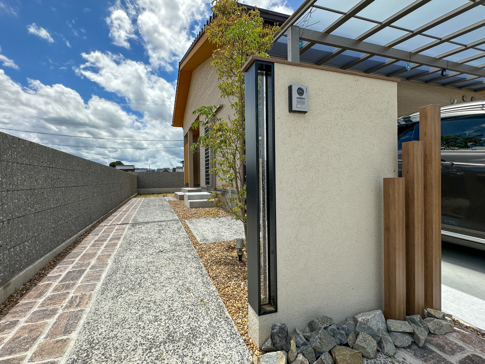 アプローチの動線も単調な直線ではなく変化を入れたデザインに。