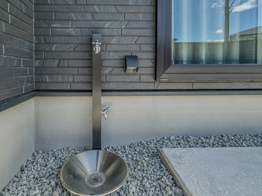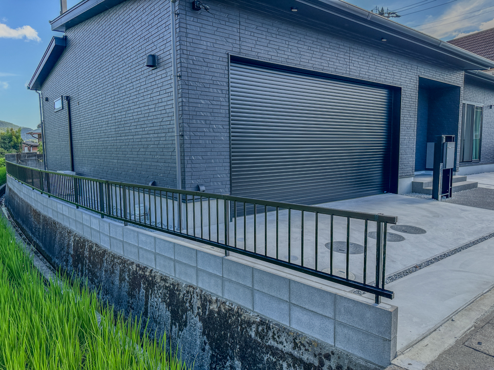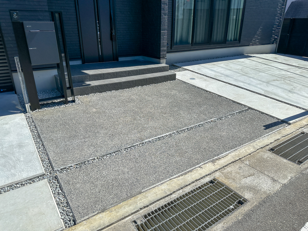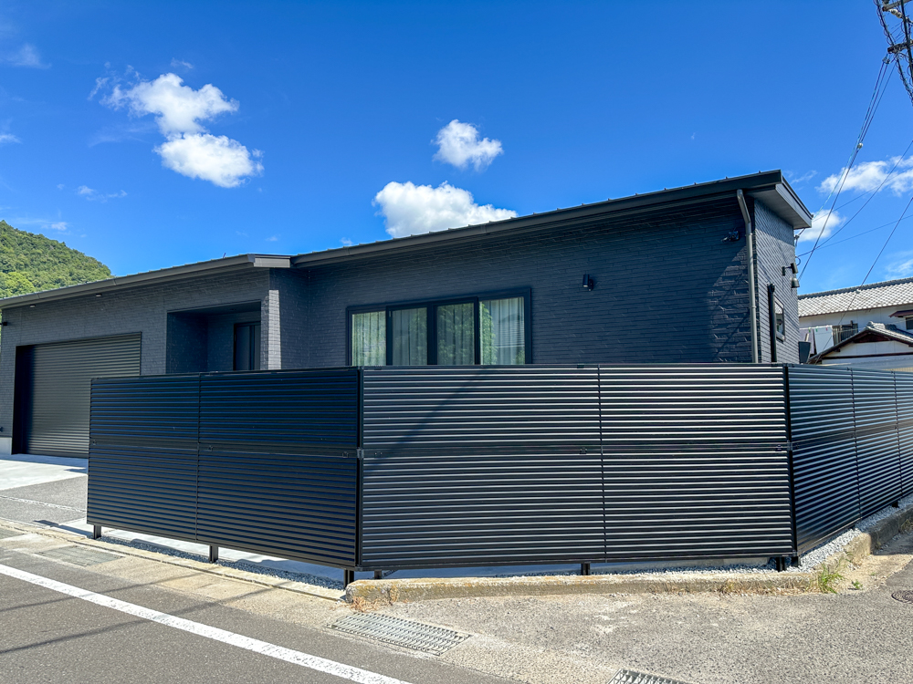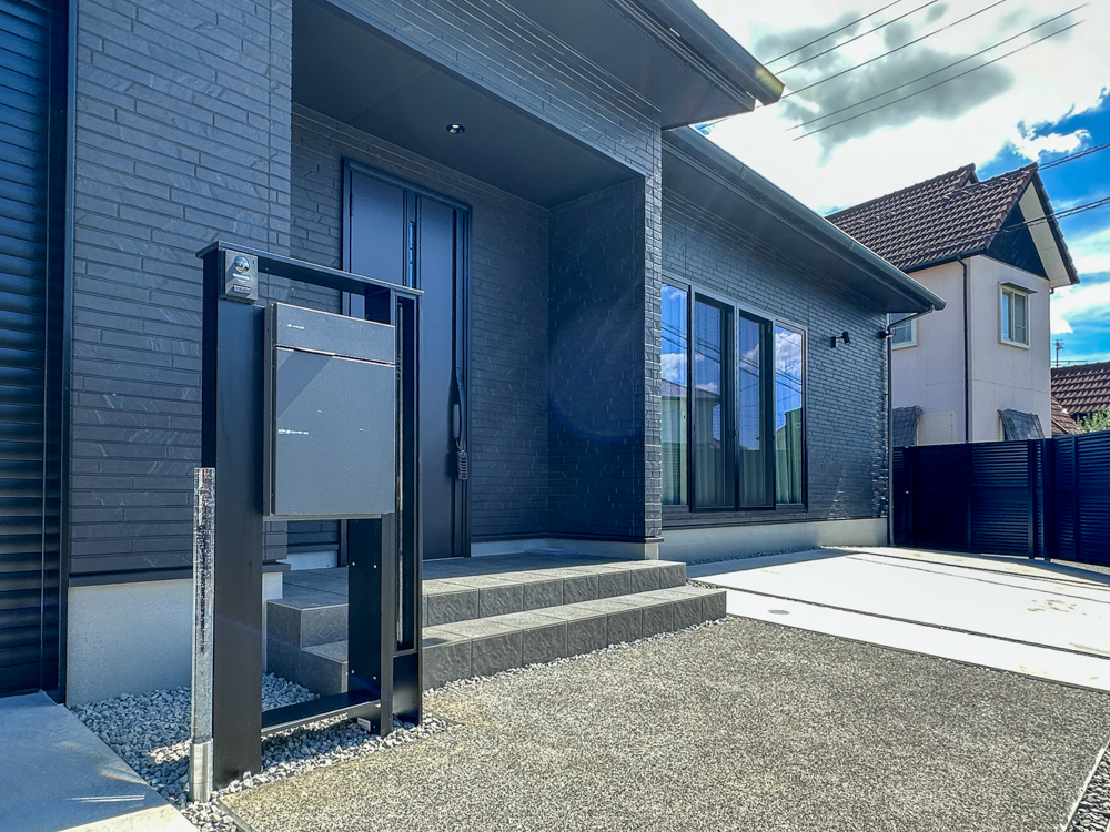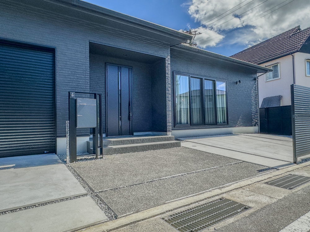 黒を基調とした外観に、直線的で無駄のないデザインが際立つシンプルモダンのエクステリア、外構。
