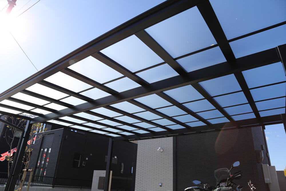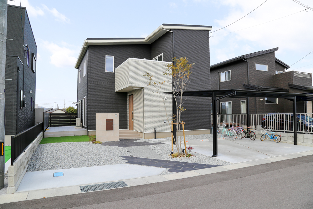 駐車スペースはゆとりを確保し、カーポートを設置することで機能性にも配慮。シンボルツリーが程よい柔らかさを添え、全体のバランスを整えています。