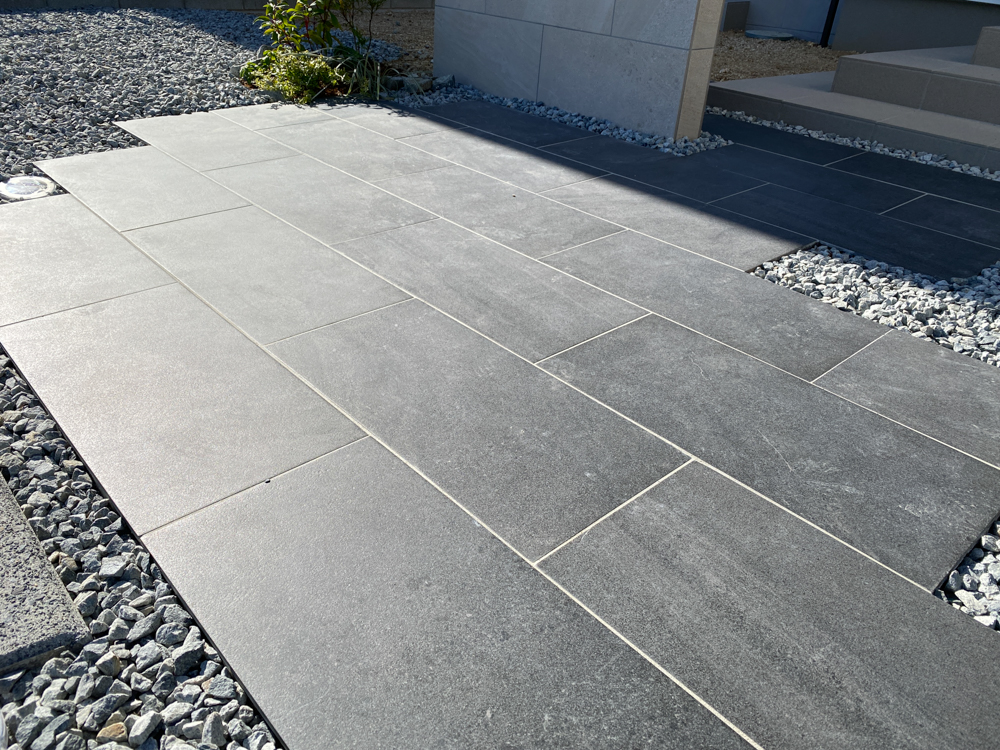 門柱とアプローチにはエクアライブ商品ノルディックストーン(門柱:ダニマルカ・アプローチ:フィンランディア)を使用し、建物の重厚感と統一感を演出。