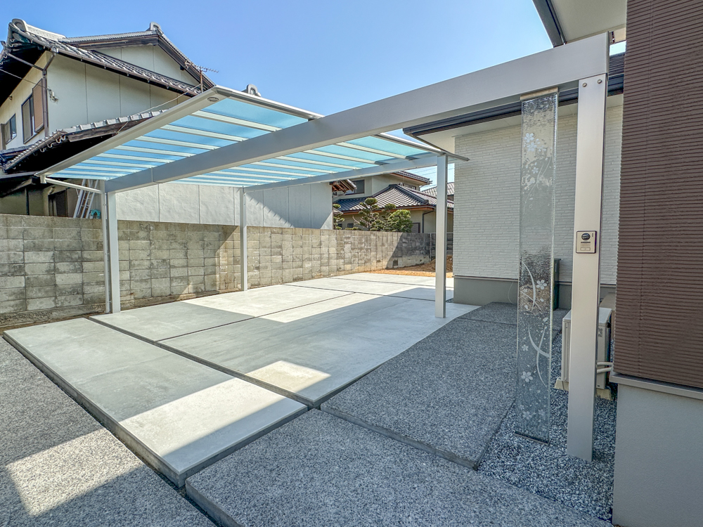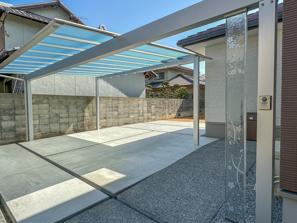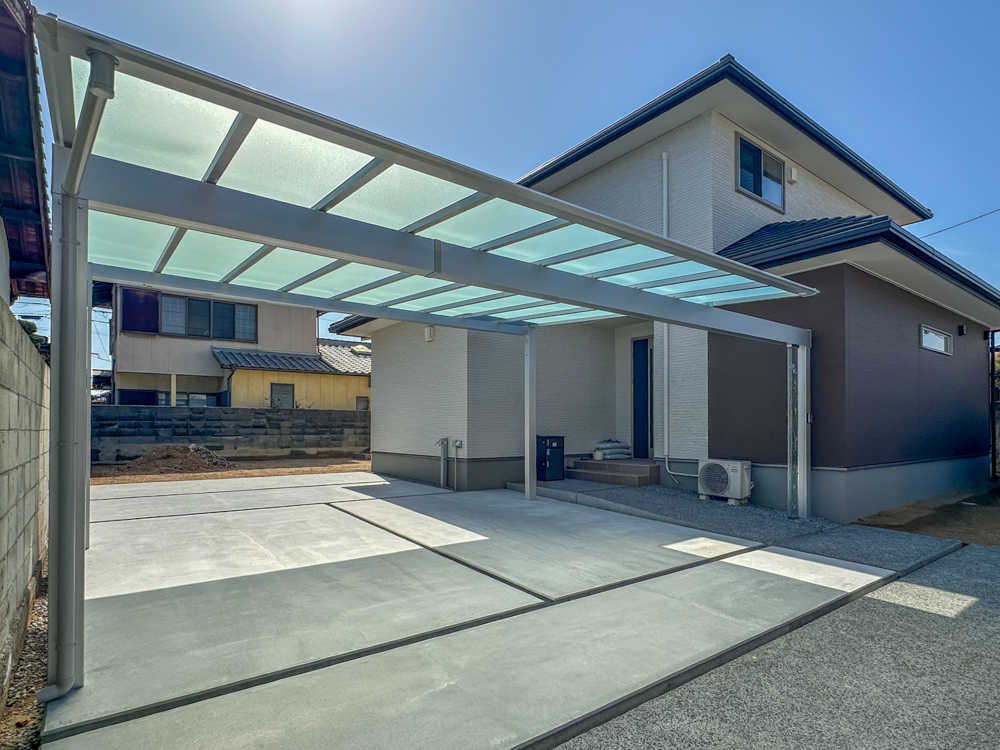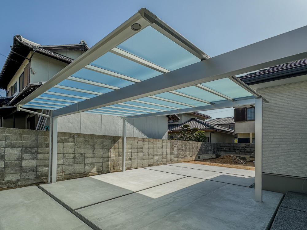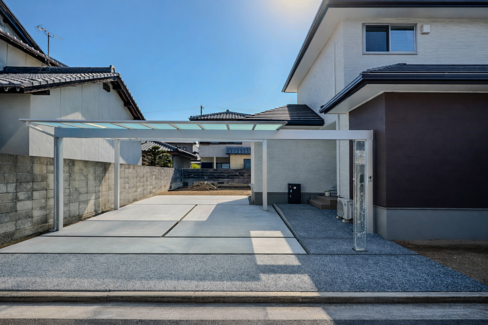 透明感のあるカーポート屋根を組み合わせることで、圧迫感のない明るい駐車スペースを実現しました。