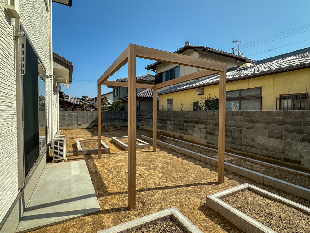 門柱にはエクアライブ商品「インゴット」を採用し、さりげない装飾と表札が外構全体のアクセントに。